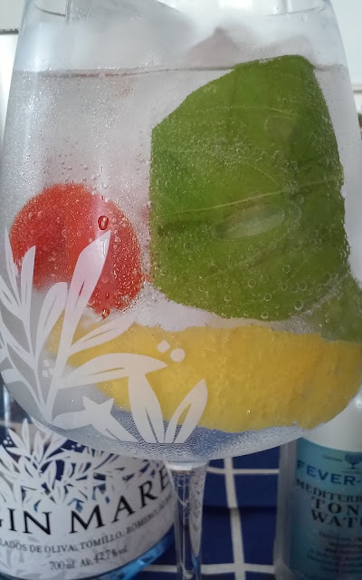 Gele o copo com algumas pedras de gelo. Com a ajuda de um Strainer ou coador retire a agua que entretanto se formou no fundo do copo. Corte uma tira de casca de limão "sem a parte branca", torça a casca para dentro do copo para libertar os óleos e passe-a pela borda do copo. Corte os tomates cherry ao meio e coloque dentro do copo juntamente com as folhas de manjericão. Adicione o gin e com a ajuda da colher de bar dar 2 a 3 voltas em redor do copo. Acabe de encher o copo com gelo e verta a agua tónica com muito cuidado para que as bolhas não rebentem. Para este efeito pode utilizar as costas da colher, deixar correr a agua através do cabo da colher de bar ou simplesmente deitar por cima do gelo. Com a ajuda da colher de bar rodar com muito cuidado todo o conteúdo para que os aromas se misturem.