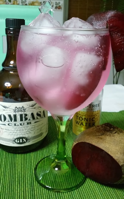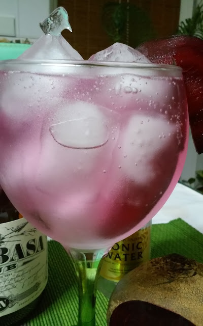 Gele o copo com algumas pedras de gelo. Com a ajuda de um Strainer ou coador retire a agua que entretanto se formou no fundo do copo. Corte 3 rodelas finas de beterraba e coloque 2 dentro do copo. Adicione o gin e com a ajuda da colher de bar dar 2 a 3 voltas para que os aromas se misturem. Acabe de encher o copo com gelo e verta a agua tónica com muito cuidado para que as bolhas não rebentem. Para este efeito pode utilizar as costas da colher, deixar correr a agua através do cabo da colher de bar ou simplesmente deitar por cima do gelo. Com a ajuda da colher de bar rodar com muito cuidado todo o conteúdo para que os aromas se misturem. Para finalizar, decore o copo com a terceira rodela da beterraba.