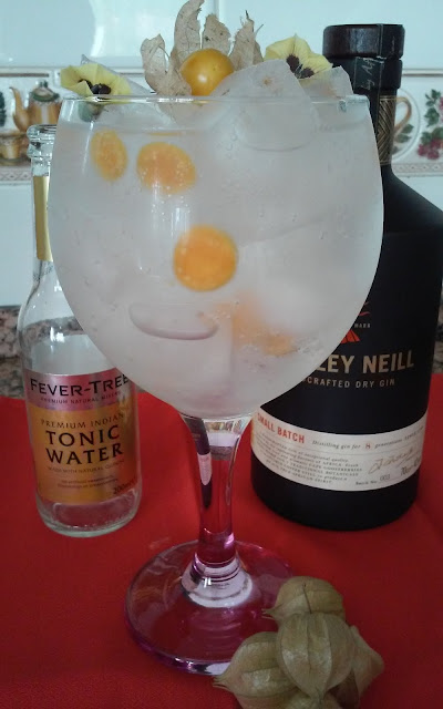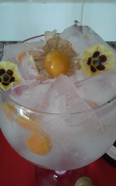 Gele o copo com algumas pedras de gelo. Com a ajuda de um Strainer ou coador retire a agua que entretanto se formou no fundo do copo. Corte em laminas dois physalis e coloque-as dentro do copo. Adicione o gin e com a ajuda da colher de bar dar 2 a 3 voltas em redor do copo para que o suco dos physalis se misturem com o gin. Acabe de encher o copo com gelo e verta a agua tónica com muito cuidado para que as bolhas não rebentem. Para este efeito pode utilizar as costas da colher, deixar correr a agua através do cabo da colher de bar ou simplesmente deitar por cima do gelo. Com a ajuda da colher de bar rodar com muito cuidado todo o conteúdo para que os aromas se misturem. Finalize, decorando o copo com o terceiro physalis e as flores como mostra a figura.