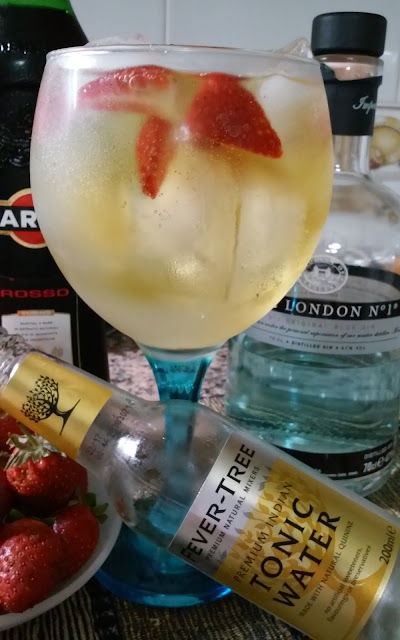 Gele o copo com algumas pedras de gelo. Com a ajuda de um Strainer ou coador retire a agua que entretanto se formou no fundo do copo. Corte um morango em pedaços e coloque-os dentro dentro do copo. Adicione o gin e o martini. Com a ajuda da colher de bar mexer ligeiramente. Este procedimento serve para que tanto o gin como o gelo adquirem os aromas dos botânicos assim como todo o interior do copo. Acabe de encher o copo com gelo e verta a agua tónica com muito cuidado para que as bolhas não rebentem. Para este efeito pode utilizar as costas da colher, deixar correr a agua através do cabo da colher de bar ou simplesmente deitar por cima do gelo. Com a ajuda da colher de bar rodar com muito cuidado todo o conteúdo para que os aromas se misturem.